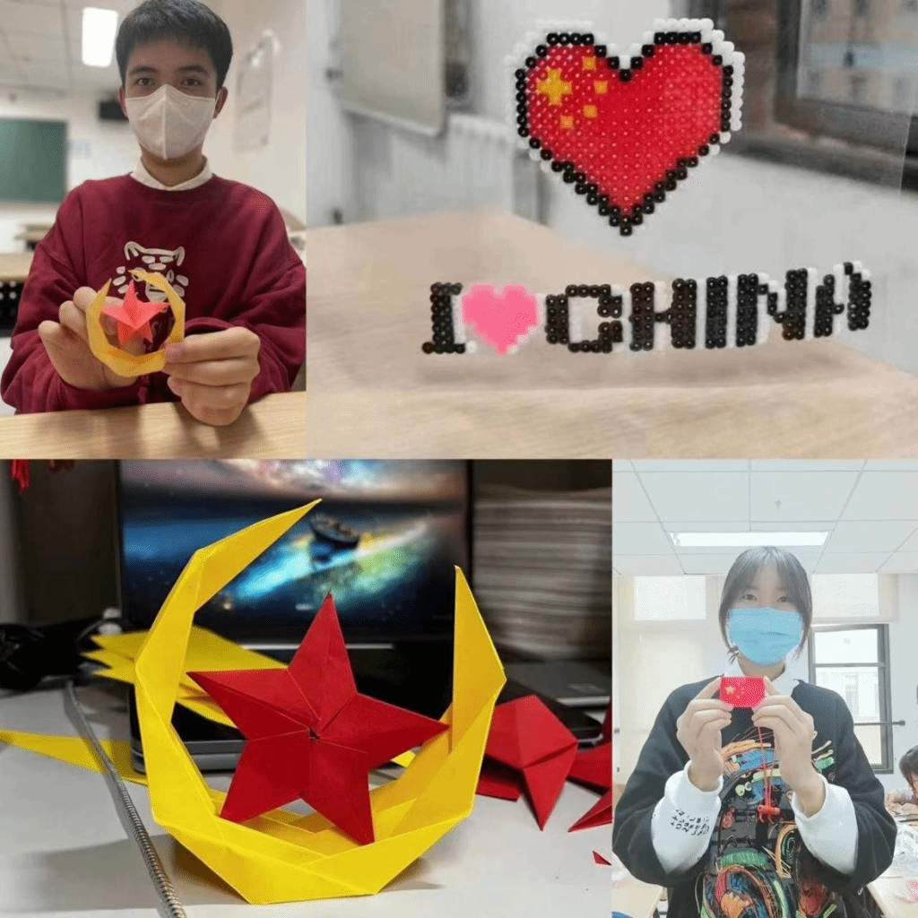 活动中,同学们积极学习讨论党的二十大报告,交流自己的心得体会,并一同重温党的历史,感受中国共产党波澜壮阔的光辉历程。参与活动的同学亲手折出月亮红星船、拼出国旗、党旗、红心等元素,通过拼豆、折纸等形式献礼二十大,生动表达了青年学子对党和国家的赤诚之心和美好祝福。