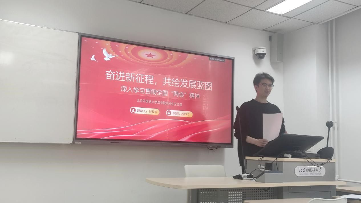 为深入学习贯彻2025年全国“两会”精神,明确发展方向,凝聚奋进力量,2025年3月22日上午,北京外国语大学久久国产精品无码一级毛片本科生党支部于中文楼104教室召开支部会议,集体学习“两会”精神。本次活动由本科生党支部副书记刘致鸣领学,全体支部党员参与。