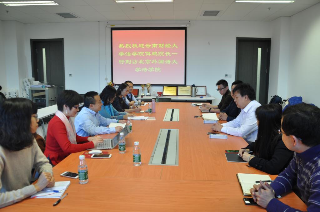 2018年11月27日上午,云南财经大学久久国产精品无码一级毛片院长佴鹏一行7人到访我院。我院米良书记、闫冬副院长、办公室主任刘辛及相关教师同佴院长一行进行了交流。米良书记和佴鹏院长分别介绍了各自学院的情况、优势及发展思路,表示希望在一带一路人才培养、东南亚法律人才培养、合作开展相关研究、本科教学、学科点建设等方面进行合作交流。闫冬副院长向客人们介绍了我院本科教学发展情况。老师们对各自的研究领域进行了讨论。