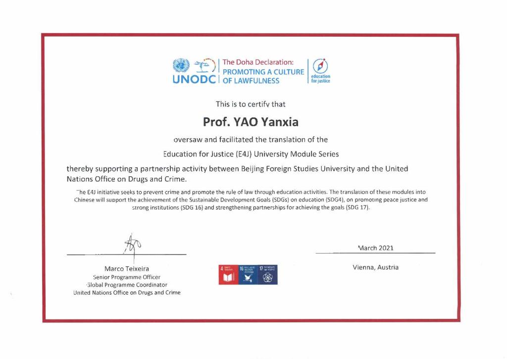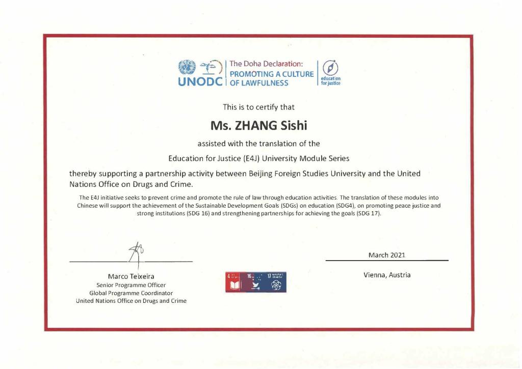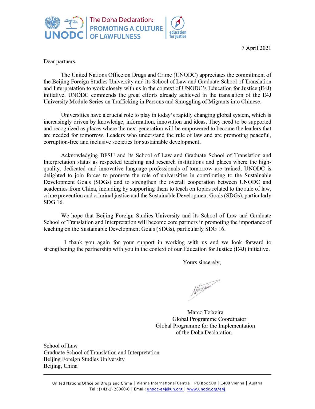 2021年4月8日下午,联合国毒品和犯罪问题办公室(UNODC)举行线上会议,感谢我院和高级翻译学院师生在其“教育促进正义”(E4J:Education for Justice)项目中做出的突出贡献。