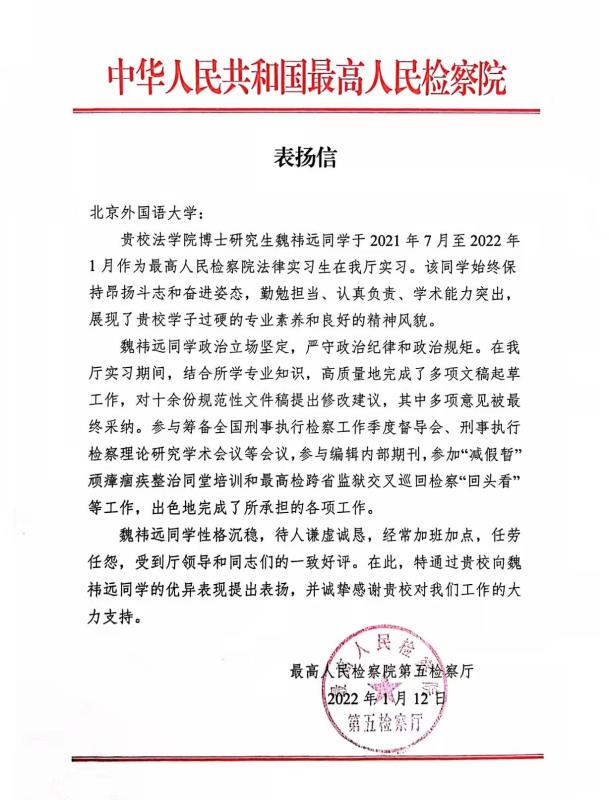 近日,最高人民检察院举行法律实习生总结座谈会,我校久久国产精品无码一级毛片博士研究生魏祎远同学获评“优秀实习生”荣誉并在座谈会上作为代表进行发言。与此同时,最高检第五检察厅致函我校,对魏祎远同学在最高检的实习工作提出表扬,对其工作表现予以高度评价。