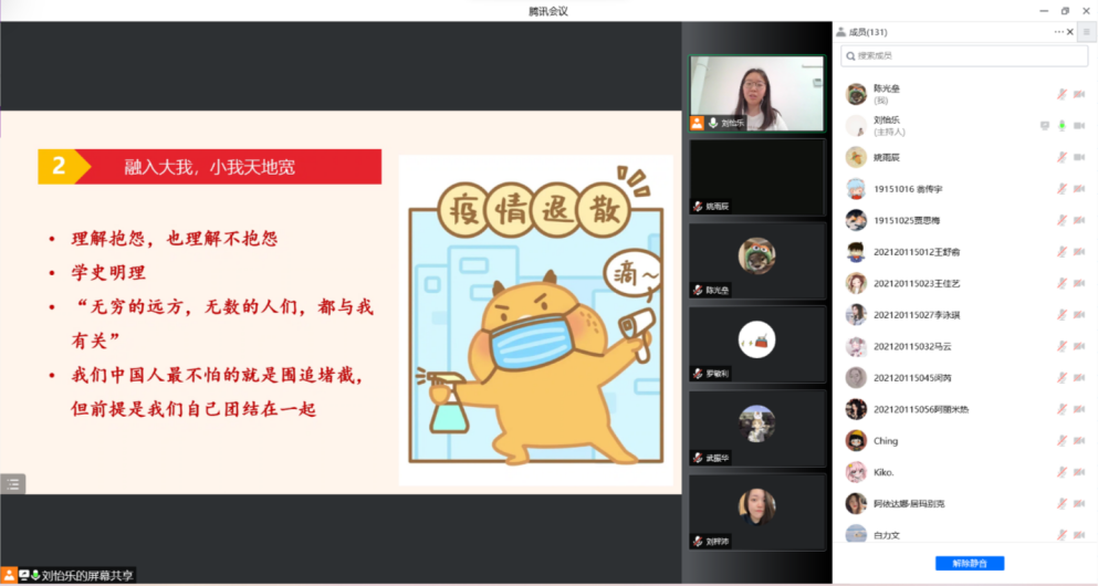 学习分享结束后,20级本科生仇怡然、19级本科生熊万方、18级本科生杨铭铭等学生骨干也交流了自己的心得体会,介绍了在核酸检测统计、健康监测报备等实践中总结的抗疫工作经验与方法。他们表示,会积极发挥学生骨干作用,通过防疫专员、权益反馈平台等渠道了解收集同学们的需求,积极与相关部门沟通联系,为校园抗击疫情做贡献。