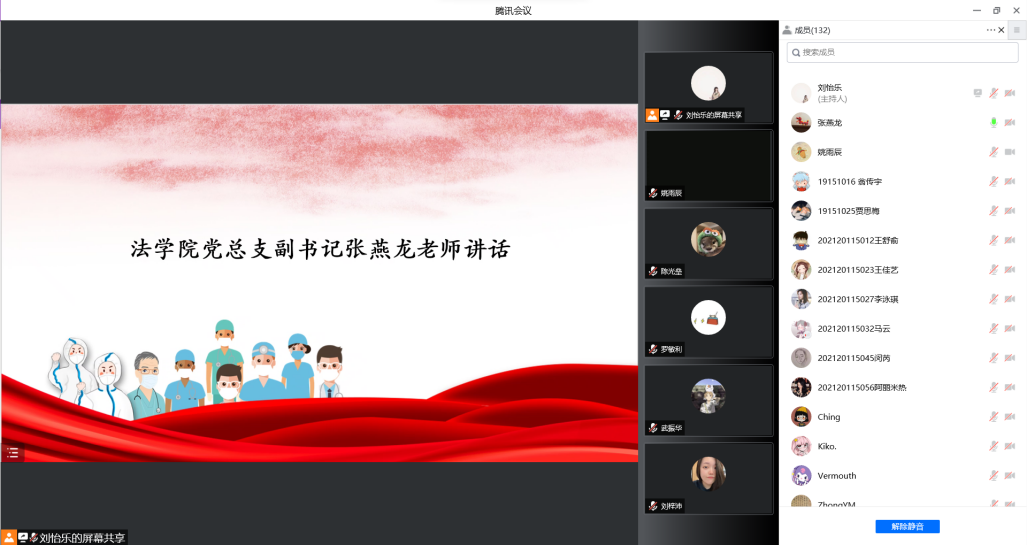 法律硕士研究生党支部书记刘文静同志从“疫情战场对党员的要求”、“坚守法律红线做合格党员”和“在疫情防控中争当党员先锋”三个方面分享了她的抗疫心得体会,鼓励大家打牢疫情防控思想基础,带领广大同学共同努力抗击疫情,在实践中争当抗疫先锋。
