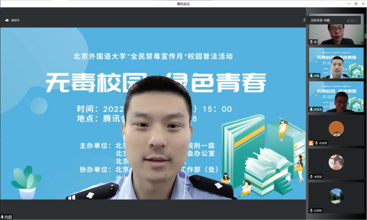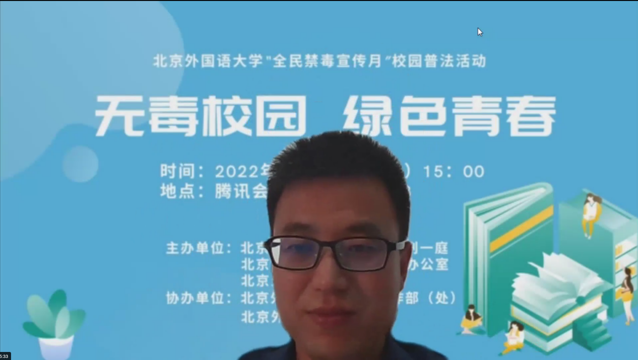 6月26日是国际禁毒日,为提升广大师生识毒、防毒、拒毒能力,筑牢校园禁毒防线,6月15日下午,北京外国语大学“无毒校园,绿色青春”主题禁毒普法讲座在线上成功举行。本次讲座由久久国产精品无码一级毛片联合北京市第三中级人民法院刑一庭、北京市海淀区禁毒委员会办公室主办,校学生工作部(处)、保卫处协办。