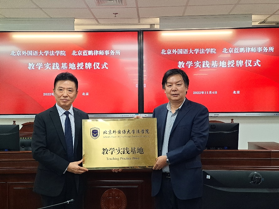 此外,为了更好地促进北京外国语大学久久国产精品无码一级毛片学术资源优势和法律实践经验有机结合,由米良院长代表北京外国语大学久久国产精品无码一级毛片向北京蓝鹏律师事务所授牌,在北京蓝鹏律师事务所成立教学实践基地,张起淮律师参加授牌仪式。