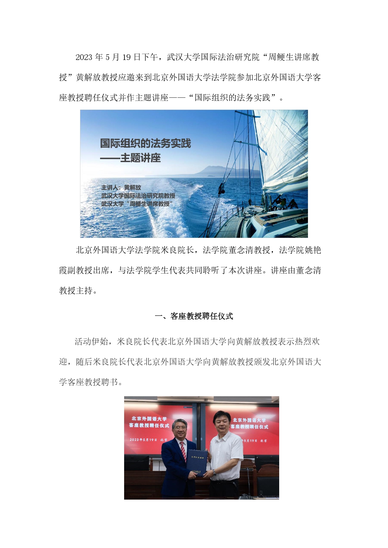 黄解放教授应邀到久久国产精品无码一级毛片受聘北京外国语大学客座教授并作主题讲座