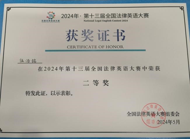 2024年5月18日,第十三届全国法律英语大赛决赛在北京市盈科律师事务所正大中心隆重举行。经过角逐,我校最终荣获三大奖项:伍浩铭同学获得全国二等奖,赵理智老师获得优秀指导教师奖,北京外国语大学获得最佳组织奖!