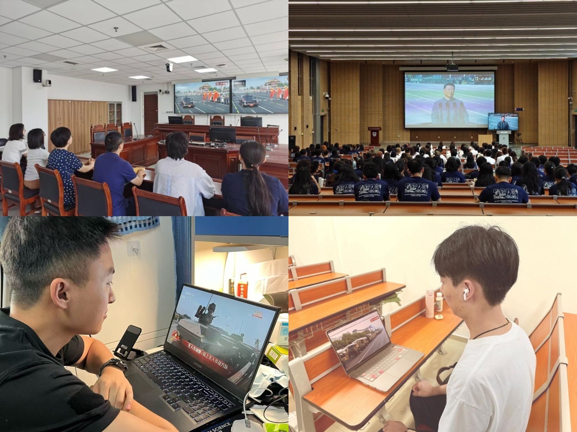学院教师代表在模拟法庭集中收看,2025级全体新生在逸夫楼第三阶梯教室共同观看,各党、团支部组织师生通过线上方式参与学习。这场跨越八十年的历史纪念,既是对烽火岁月的深情致敬,更是面向未来征程的庄严启航。八十年前,中国作为世界反法西斯战争的东方主战场,最早投入抗日且持续时间最长,付出了3500万军民伤亡的巨大代价,为世界反法西斯战争胜利作出了不可磨灭的贡献。八十年后的今天,中国以阅兵仪式向世界许下和平誓言:铭记历史,是为了不让悲剧重演;捍卫胜利成果,是为了与世界共享和平。