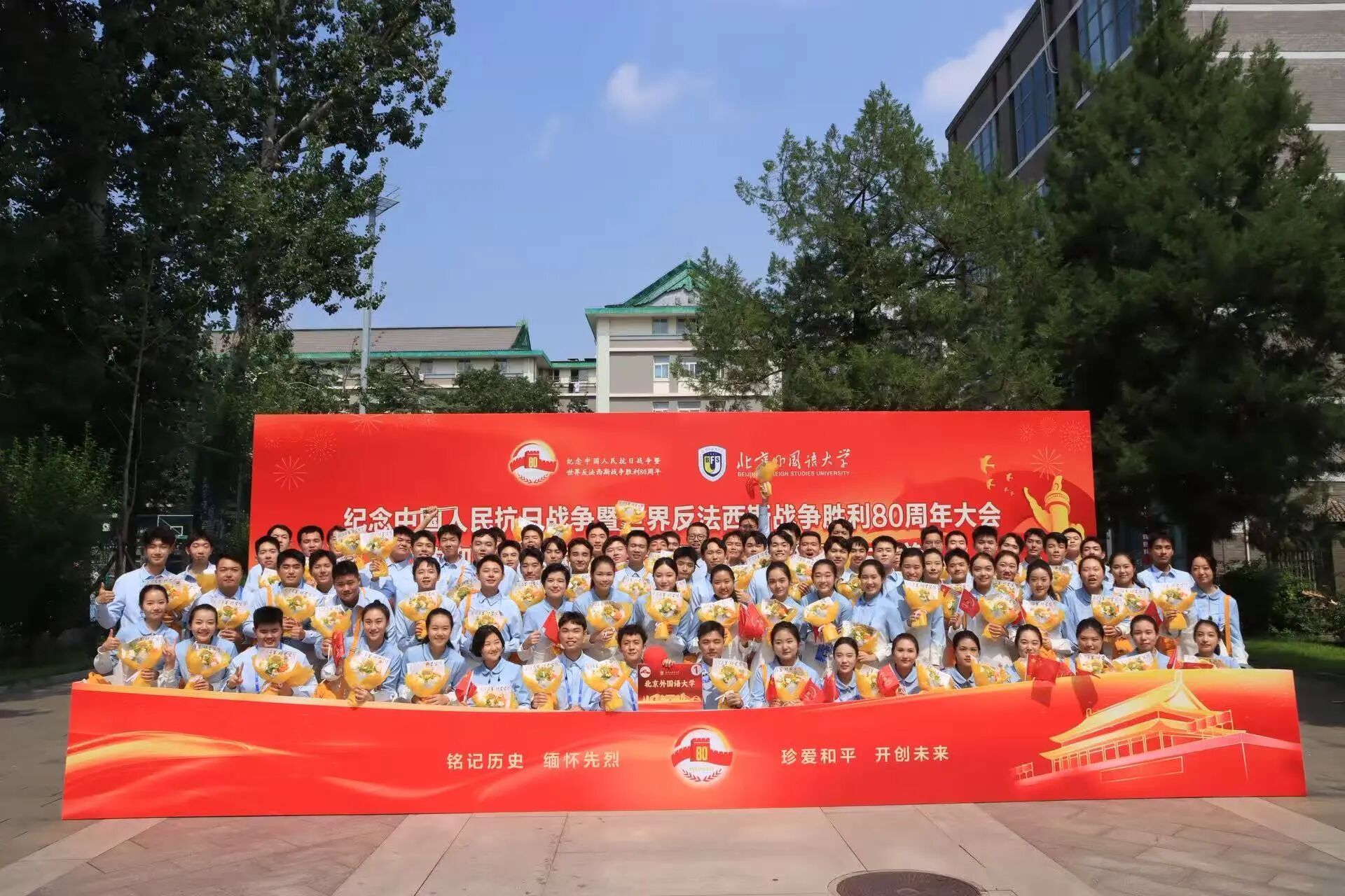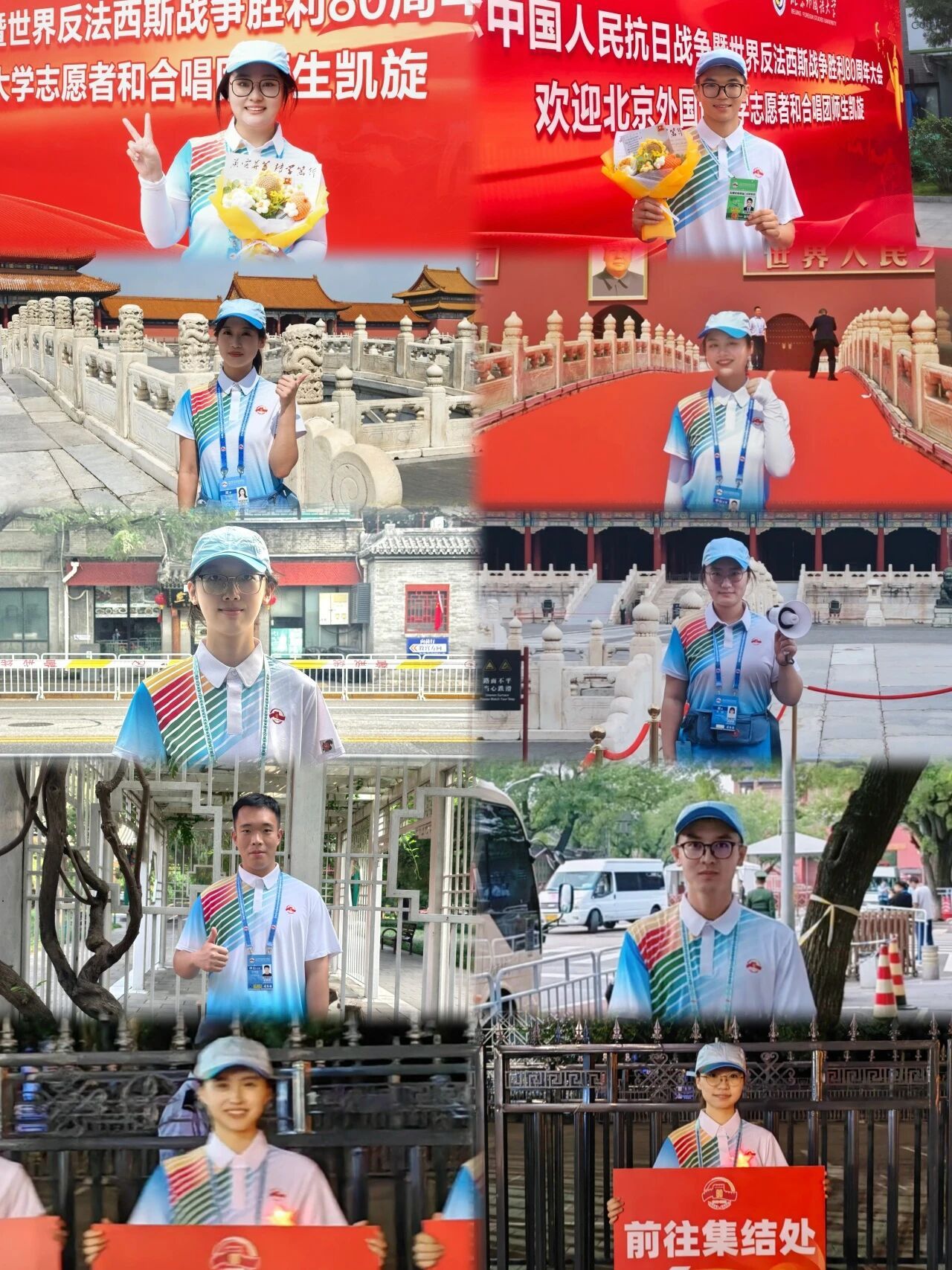 9月3日,中国人民抗日战争暨世界反法西斯战争胜利80周年纪念活动在北京天安门广场隆重举行。各界代表和群众汇聚北京天安门广场隆重集会,党和国家举行盛大阅兵仪式,共同铭记历史、缅怀先烈、珍爱和平、开创未来。我院共有14名同学担任广场合唱队、志愿服务队的志愿者,圆满完成任务,展现了北外青年的责任与担当。