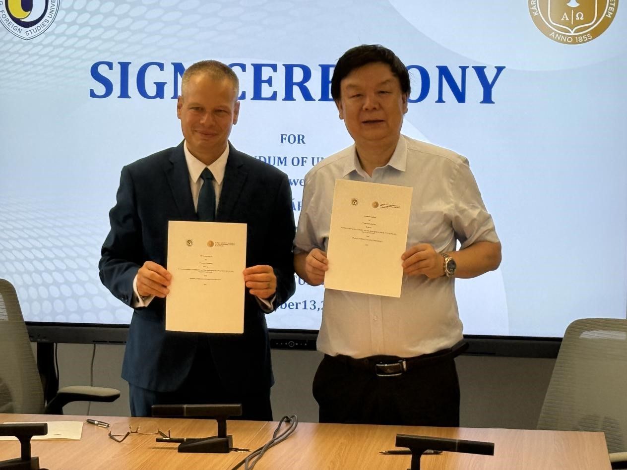 9月13日,北京外国语大学久久国产精品无码一级毛片与卡洛里加斯帕新教大学久久国产精品无码一级毛片谅解备忘录签约仪式在北京外国语大学举行。北京外国语大学久久国产精品无码一级毛片院长米良教授和卡洛里加斯帕新教大学久久国产精品无码一级毛片副院长Adam Booc教授代表双方学院在谅解备忘录上签字。