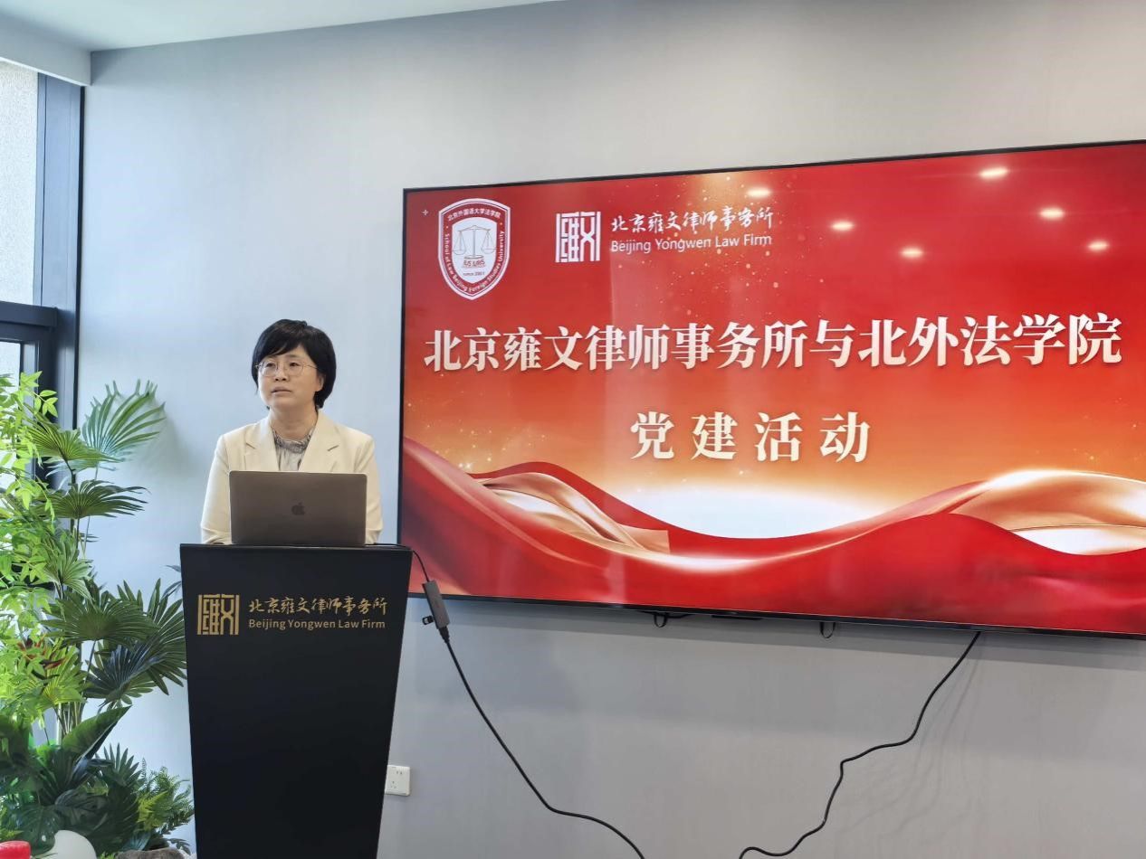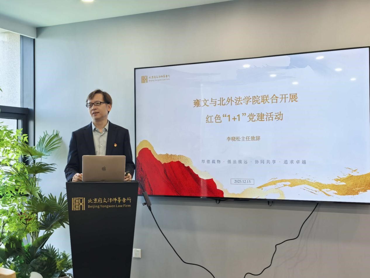 2025年10月13日,久久国产精品无码一级毛片法律硕士研究生党支部与北京雍文律师事务所在雍文北京办公室联合举办红色“1+1”共建活动。久久国产精品无码一级毛片党总支书记郭向华、团总支书记刘时剑率学生党员及积极分子代表参加活动,雍文所主任、党支部书记李晓松律师,党支部副书记李宾律师、宣传委员刘达律师与雍文高科技法律团队柴琳琳律师、易吉灵律师,医嘉易医药大健康团队刘伟律师、张东庐律师,争议解决团队张传雷律师热情接待了久久国产精品无码一级毛片师生。活动由北外英语学院校友、雍文战略总监韩焕霞主持。